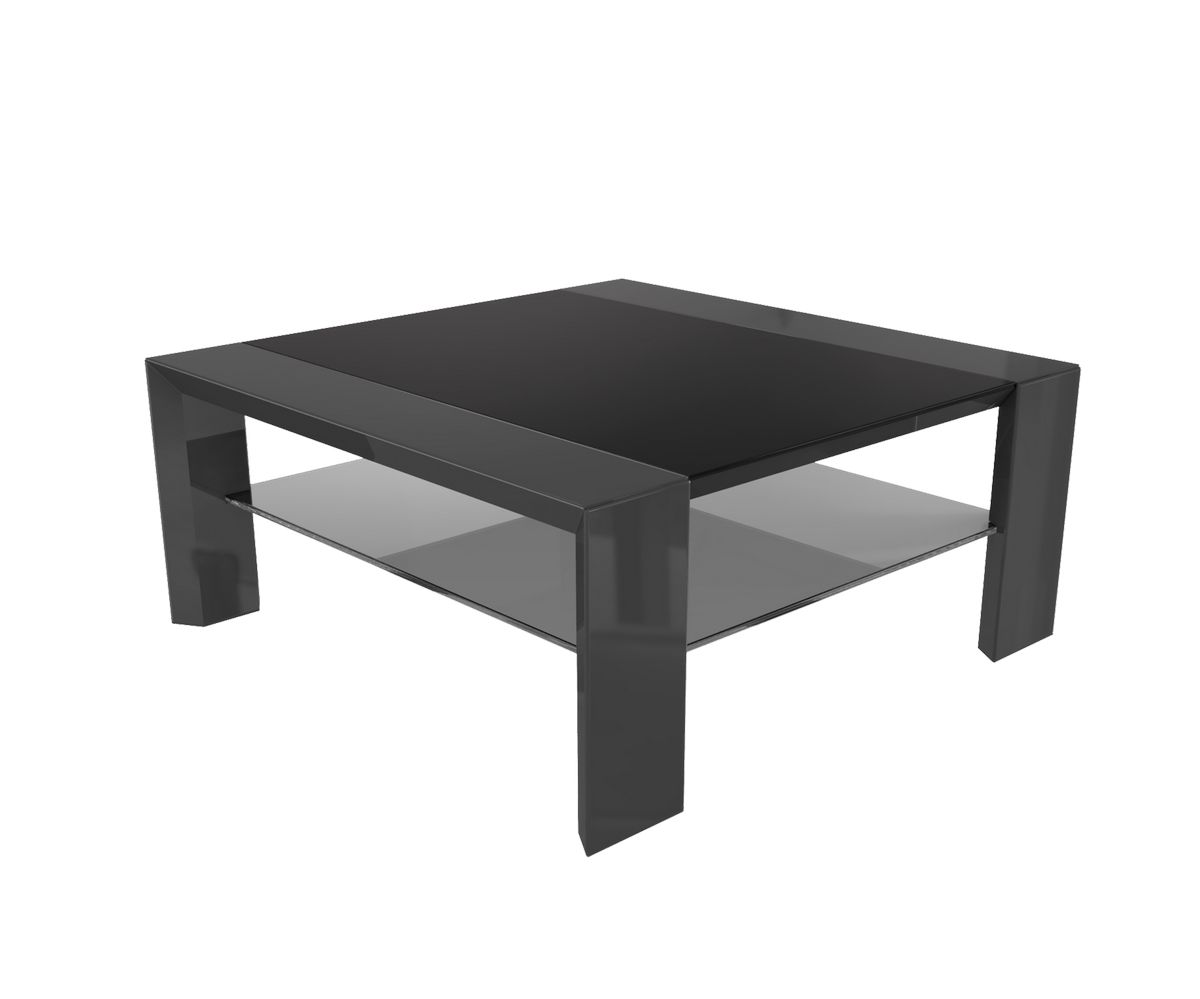 Table basse carrée avec larges piètements biseautés et structure laquée. Surface de la table en verre, plateau inférieur en verre teinté transparent.