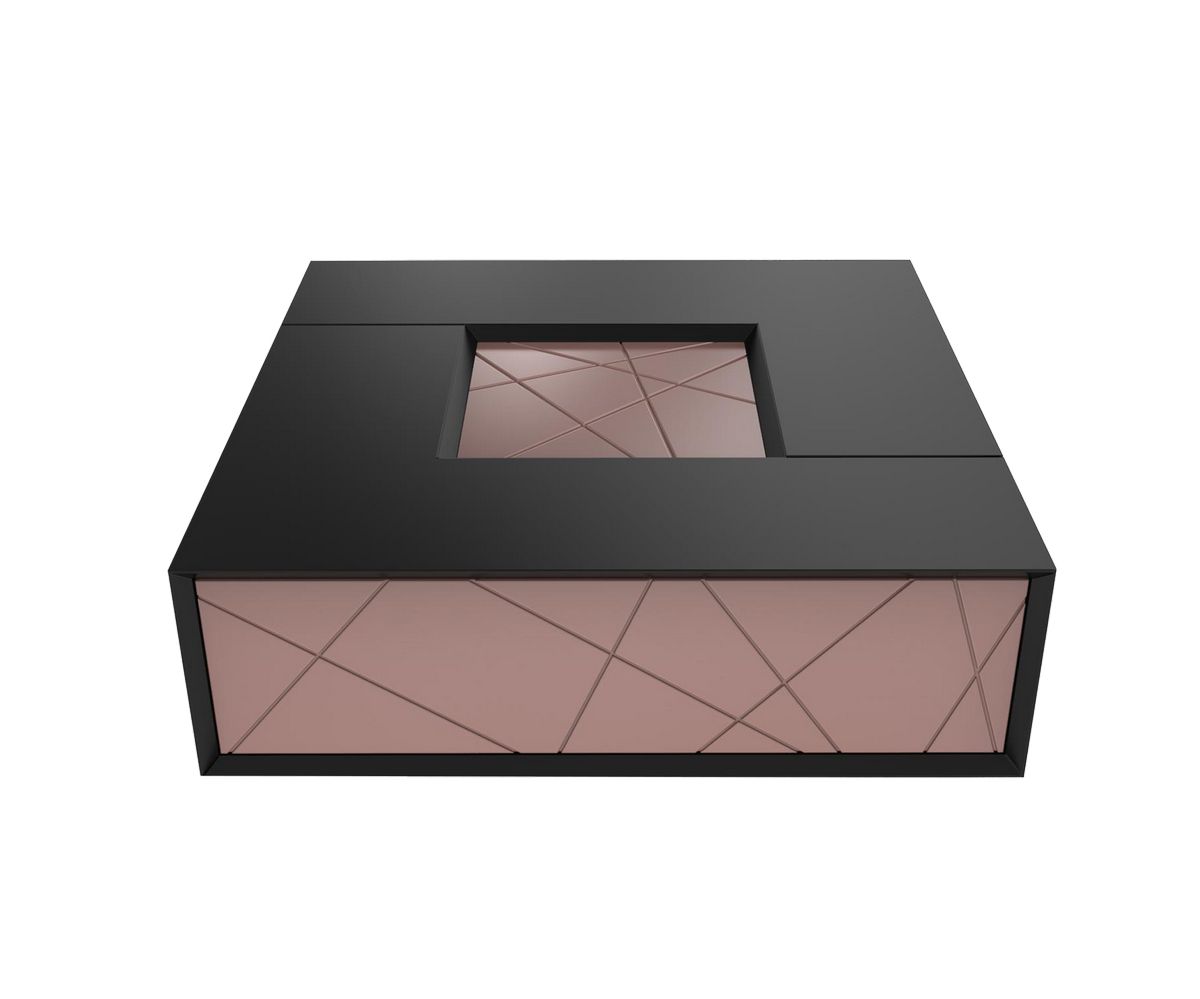 Table basse laquée aux chants biseautés avec décor en MDF rainurés.