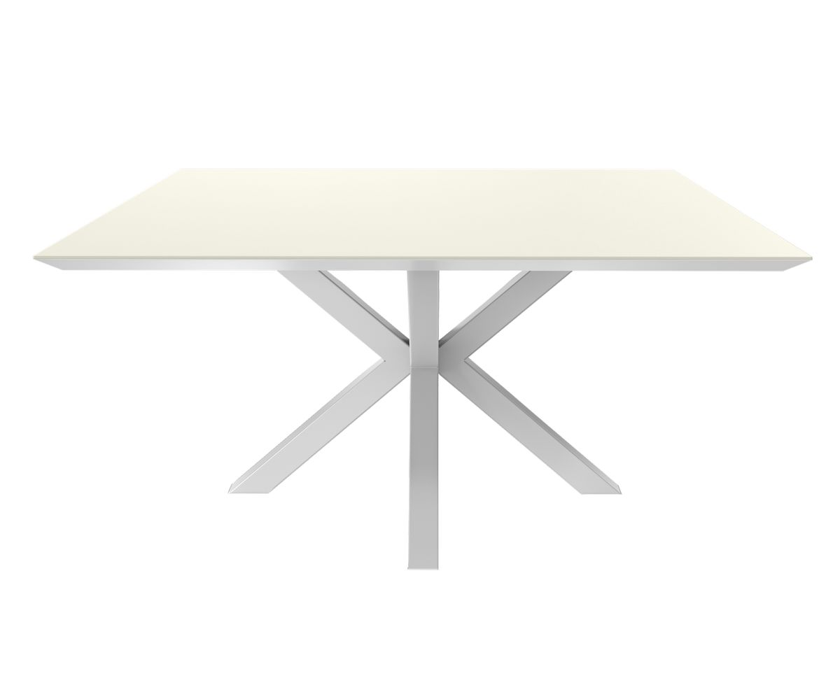Table de repas carrée avec dessus en céramique et pied en acier laqué. Elle peut accueillir jusqu'à 8 convives.